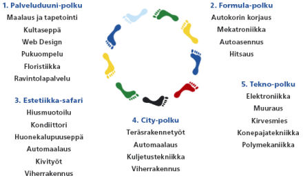 Katsele mitä kilpailulajeja löytyy kustakin polusta. Mistä polusta tai poluista löytyivät ne lajit, jotka ovat lähimpänä sinun alaasi? Mikä on ala, jolle haluat suuntautua? Mikä on ala, jolle et halua suuntautua? Huomioi, että voit myös ketjuttaa polkuja risteysasemien avulla. Voit tapahtuman aikana siis tutustua useampaakin kuin yhteen polkuun. Kun olet löytänyt sinua kiinnostavat polut, siirry seuraavaan tehtävään: Lisätietojen hankinta 1